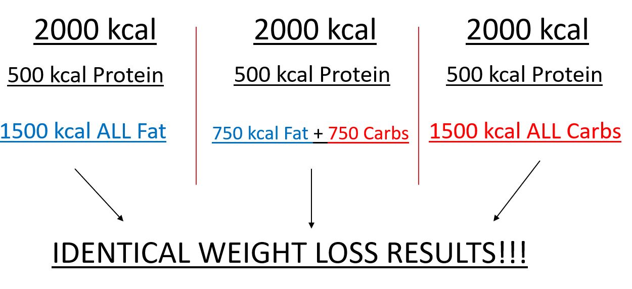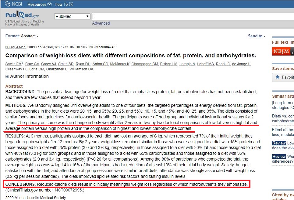 This study compared weight loss and health effects of high vs low fat, high vs low carb, and high vs low protein. All resulted in THE SAME weight loss: