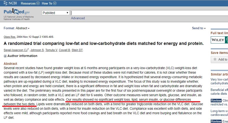It showed that if you take two diets where total calories and protein are matched, with different fats vs carbs ratio in them, that there was NO difference in weight loss, nor any of the health parameters.